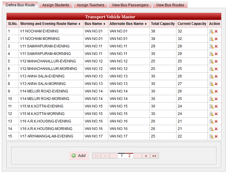 In Transport Vehicle user can distinguish which are the buses goes Morning / Evening / Both. This separation is done keeping in account that school may wish to categories which are the passengers travel only in Morning / Evening / Both times. And in case of break down of vehicle, the user can assign alternate bus to pick / drop the passenger. This intimation can be sent to Parents & Staffs through SMS.