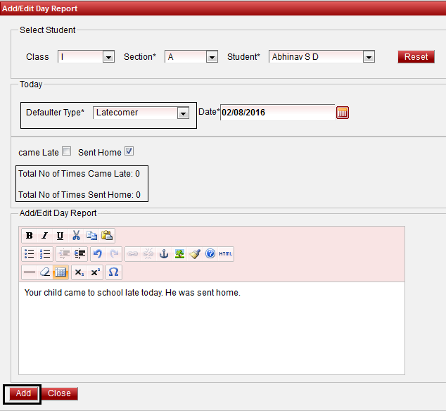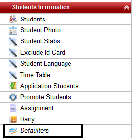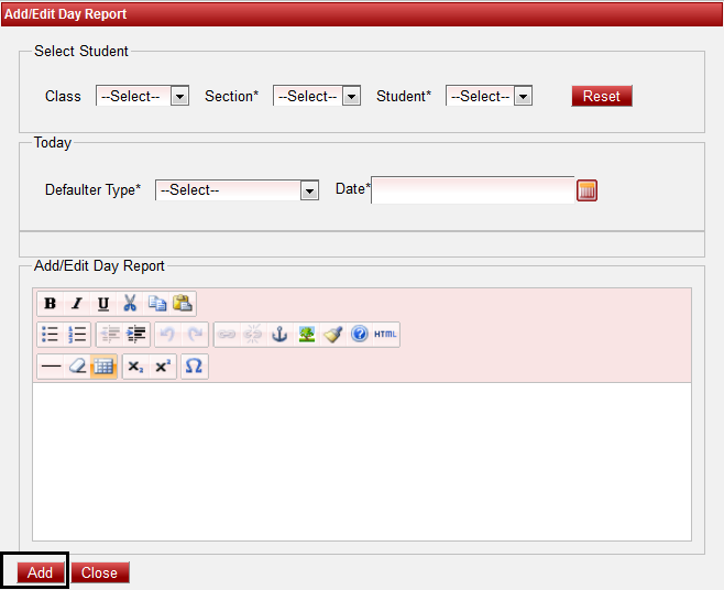 Select class, section, student name, defaulter type, Date and in Day/Edit Day report write the report which you want to save in the defaulter list of that student.