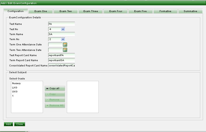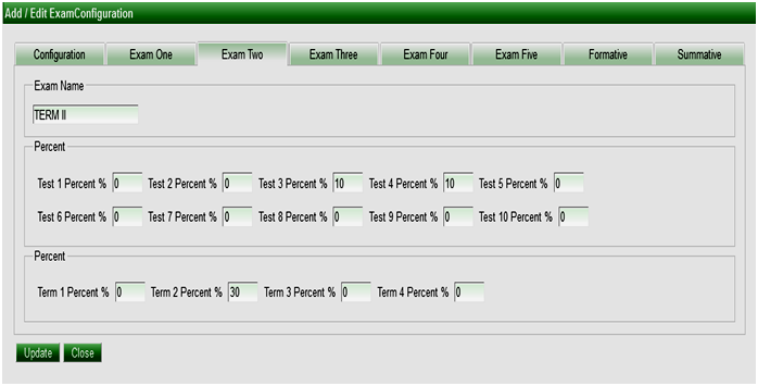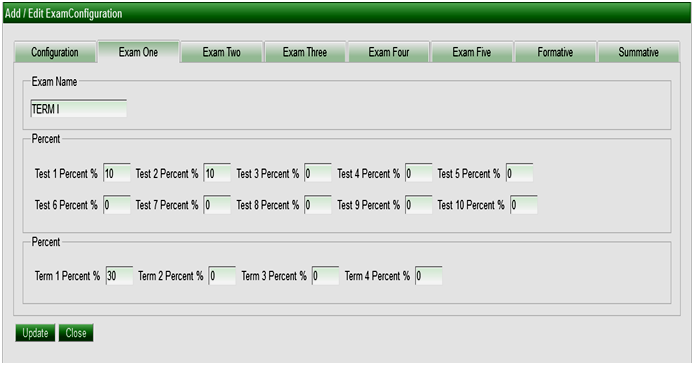 Exam configuration is a global setting done for the respective academic year. It is used to configure number of tests and terms of your school, where you can configure how many test/term school will conduct in current academic session. Along with configuring the test and term, user can take the combination aggregate of test and term and arise at the total score after each term exam and final/ overall grade. The configuration menu does not restrict different school's in configuring respective academic exam details.