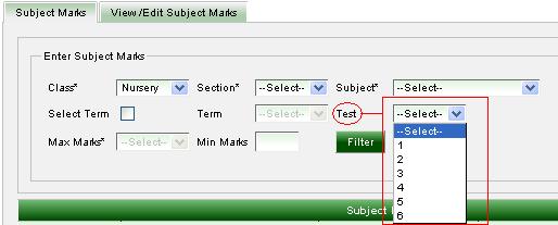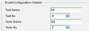By default, software will display the configured Test Name as “FA”, Test No. as “4”, Term Name as “SA”, and Term No. as “2”. This configuration is editable, as the user configure , the respective number of test and term will be displayed in other modules of Grading System where test and term selection is provided.