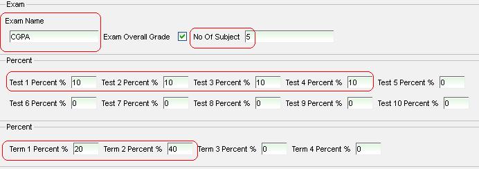 Enter Exam name (CGPA) and Check on Exam Overall Grade   and Enter number of subjects (only total number of Part A subject). Enter Test Percentage and Term Percentage. It will show like below dialog;-