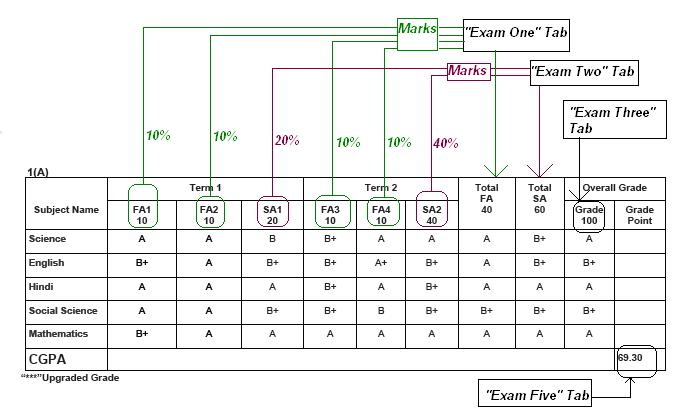 From FA3 and FA4 we are considering 10% of marks (Maximum marks of 25) and  from SA2 we are considering 30% of marks (Maximum marks of 50) and we are converting it to a scale of 100 in order to display the corresponding grade in the report card.
