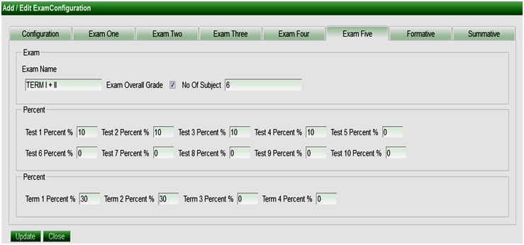 Exam five tab is used for configuring the overall Formative Assessment (FA) and Summative Assessment (SA) marks and displaying as grades instead of marks.