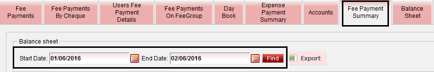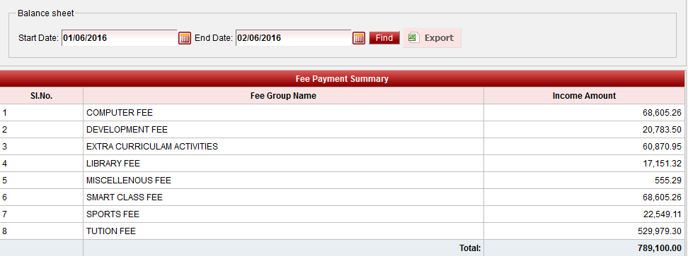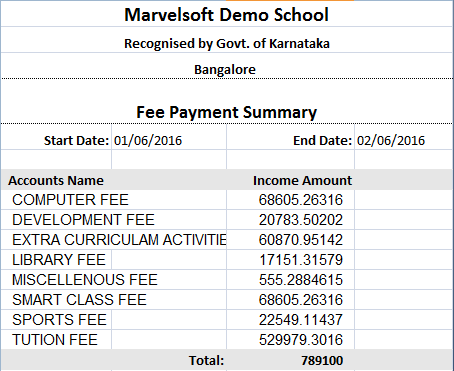 In this module you can get details like for which fees how much total amount school has collected in the particular dates.