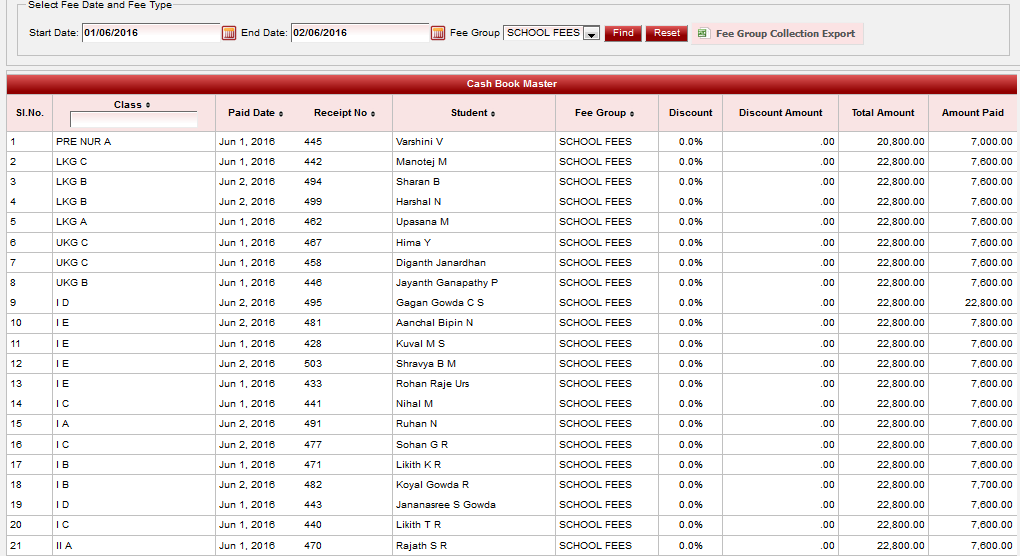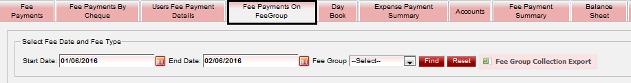 Select Start Date, End Date, Fee Group (Which fee Group you want data to display) and click on Find.
