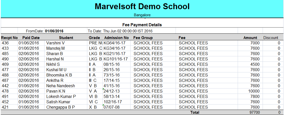 In this module you will get a fee collection detail as per the Fee Group wise.