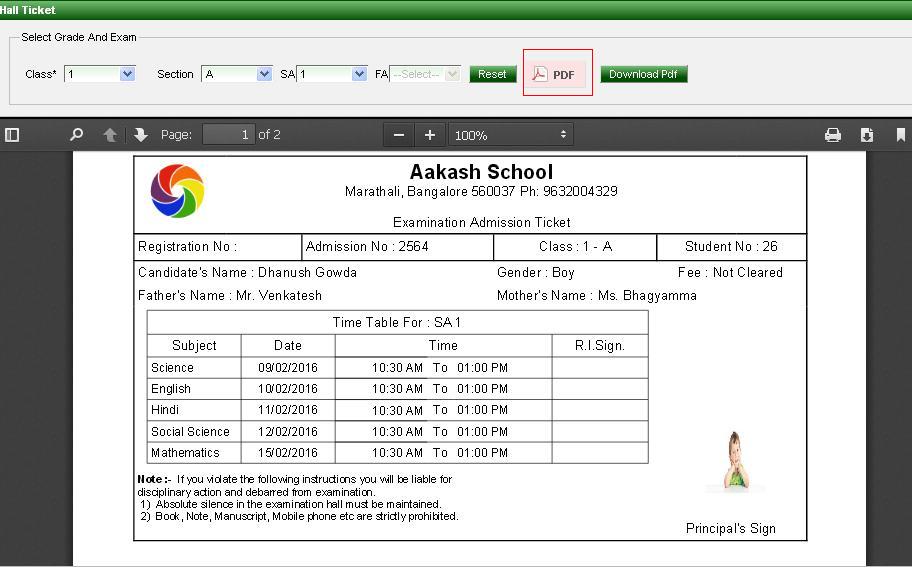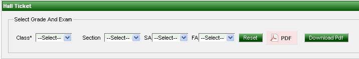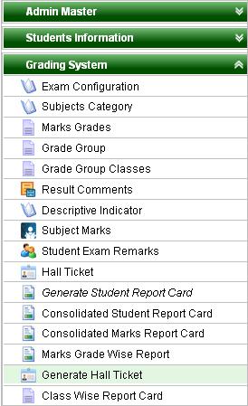 Generate hall ticket menu assists you in generating the hall ticket for a selected test (FA) / term (SA). |