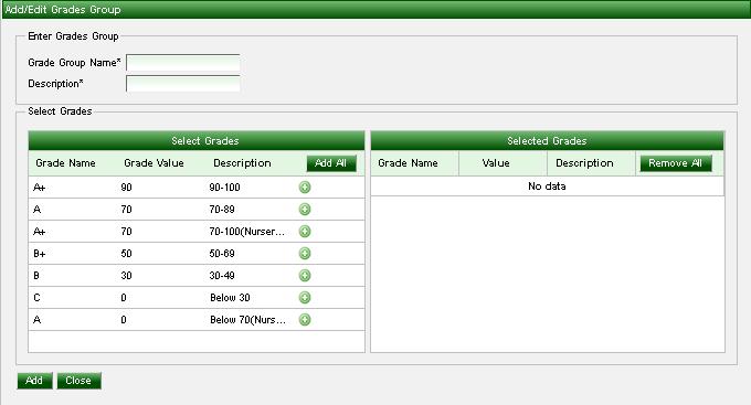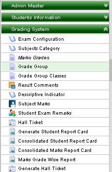 Grade group module is used to categorize grades into different groups. From this you can define different grade groups for different classes. Example:Grading for nursery and for other classes are different. For nursery class we can have two grades. -> “A if score is greater than 70%” and -> “A+ if the score is less than 70%. For other classes, we can use Marks Grades - “A+”, “A”, “B+”, “B”, and “C”. |