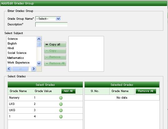 This section is used to assign grade group to classes & subjects. It helps to display grades for particular subjects and classes at the time of marks/grades entry in the Subject Marks menu.