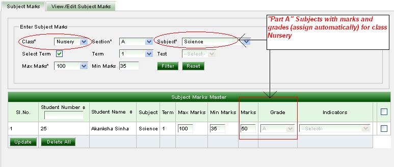 Enter the PART A subject marks for "NURSERY" and click on update;-