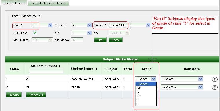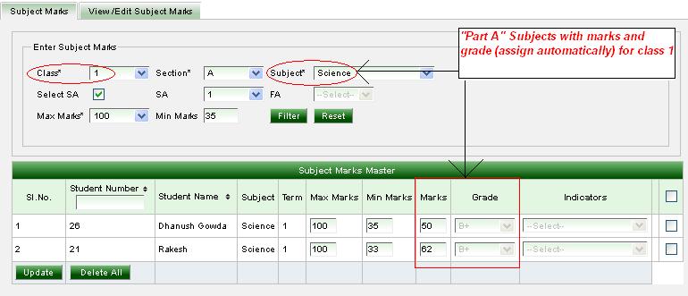 After assigning Marks Grades, Grades Group and Grade Group Classes at the time of marks and grades entry in Subject Marks section is as shown below:
