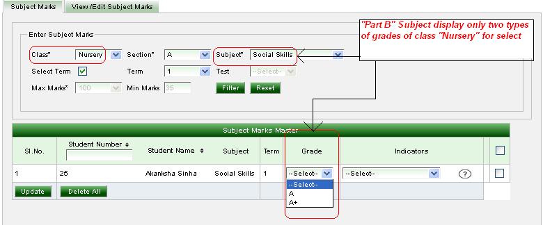 Enter the PART B subject grades for Class "NURSERY" and click on update: