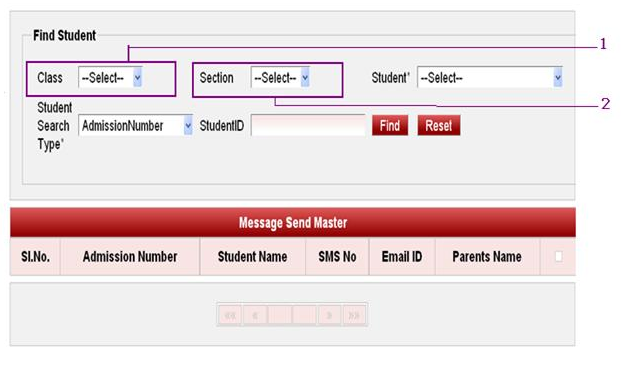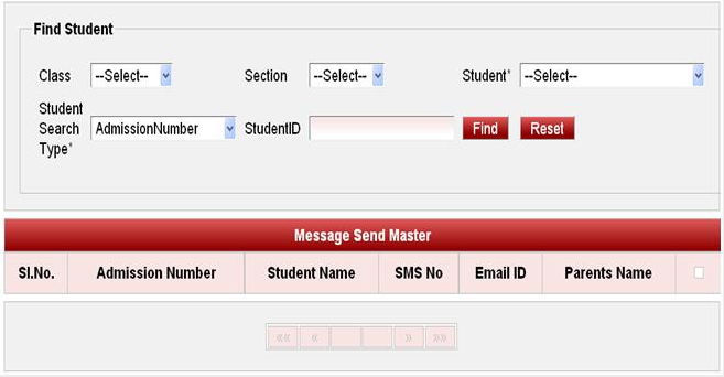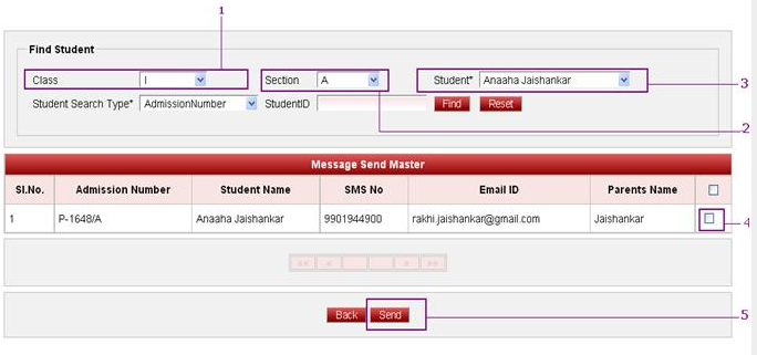 Here you can send message to parent’s number or to their email id based on which class and section. We can also search student by Admission Number, Student Id, and Application Number.