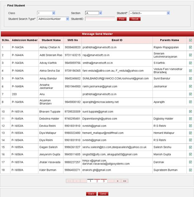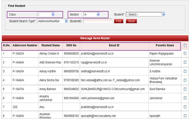 As soon as you select Class and Section, students in the selected class and section, their Admission Number, Name, SMS NO, Email ID, Parents Name will appear in the table as shown below.