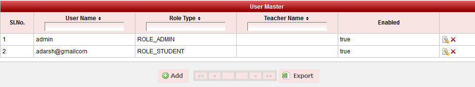 | You will be able to view the user with user name as their Email id and Role type set as "ROLE_STUDENT".