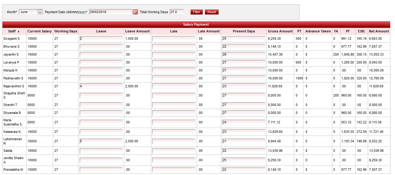 6. Enter the number of paid leaves taken and late coming days, and total present days. The gross salary will be auto calculated. And for the staff who are PF applicable, the custom amounts will be deducted and final net salary will be calculated.