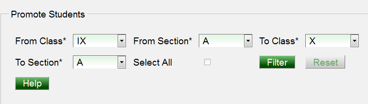 • On clicking Promote students tab, a page with following fields will be displayed.
