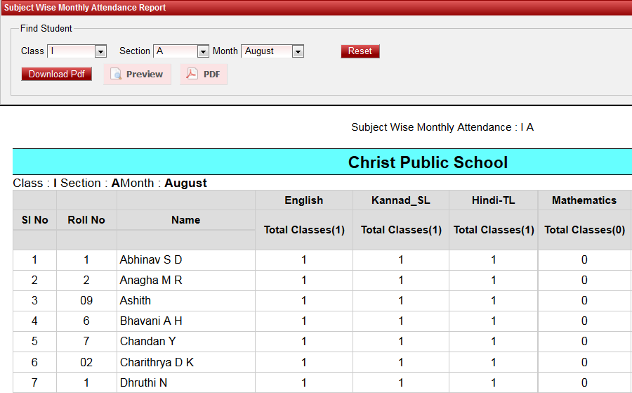 In this you can check that how many total classes are there in a month and how many classes student attended in each subject.