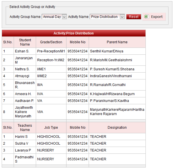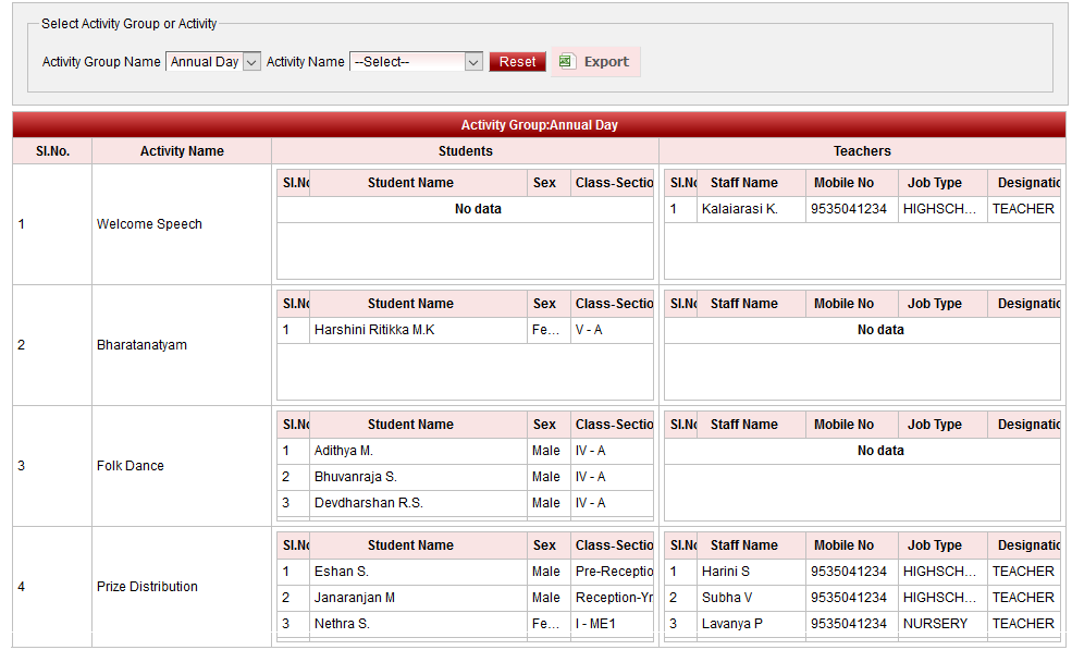 Reports can be generated for the Activity grouped. This reports will be used for tracking events. Filing up yearly data , Report of students in hostel etc.