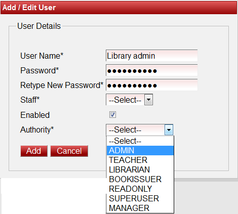How to Add new User? Click on Add button to Add a new user. On clicking Add button a page will be displayed as shown below.