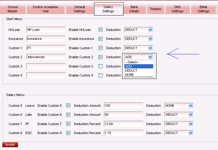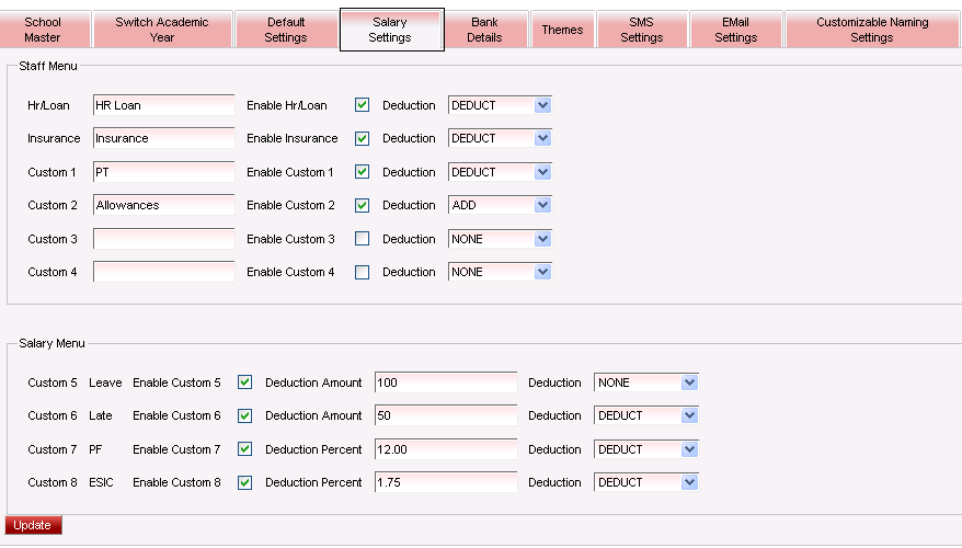 To set the salary configuration, select Options -> Settings -> Salary Settings Image Added Enter the particulars under staff menu those needs to be displayed in staff details. Enter the particulars under salary menu that needs to be displayed in salary payment details. Select the Deduction type. We can choose salary menu particular should be added or deducted from the salary or also even it can be selected none, where either addition or the deduction takes place. |