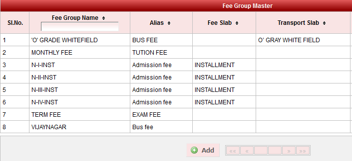 | Create Fee Group defines the no of fee's collecting in one receipt is called Fee Group. Fee groups are creating on the basis of how we are collecting fee's for example Annually,Monthly and Term wise. Step 1: Go to Masters,Click on Fee Groups Image Removed